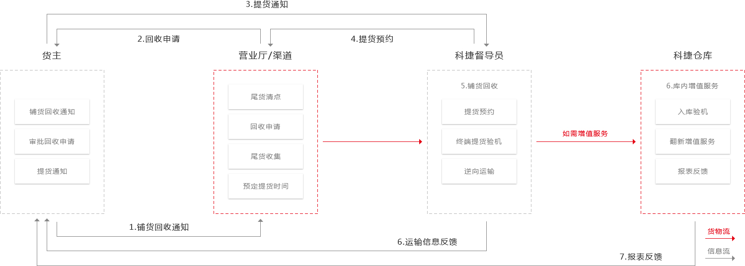 科捷物流為客戶提供演示機(jī)回收、鋪貨回收、消退回收、拒收回收、維修機(jī)回收返回中心倉/省倉/地級市倉、營業(yè)廳/渠道調(diào)撥的逆向物流服務(wù),并在提貨終端提供貨品質(zhì)檢、序列號校驗、更換配件和外包裝、軟件升級等增值服務(wù)。