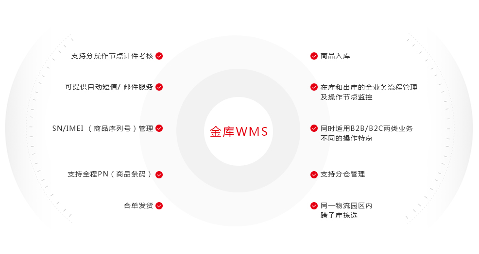金庫WMS功能涵蓋商品入庫、在庫和出庫的全業(yè)務(wù)流程管理及操作節(jié)點監(jiān)控,同時適用B2B/B2C兩類業(yè)務(wù)不同的操作特點,支持分倉管理、同一物流園區(qū)內(nèi)跨子庫揀選、合單發(fā)貨,支持全程PN(商品條碼)、SN/IMEI (商品序列號)管理,支持分操作節(jié)點計件考核,可提供自動短信/ 郵件服務(wù)。