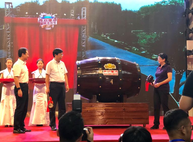 8月3日開幕式上,“燕京啤酒文化節(jié)”全球行動(dòng)首個(gè)紀(jì)念桶揭幕。