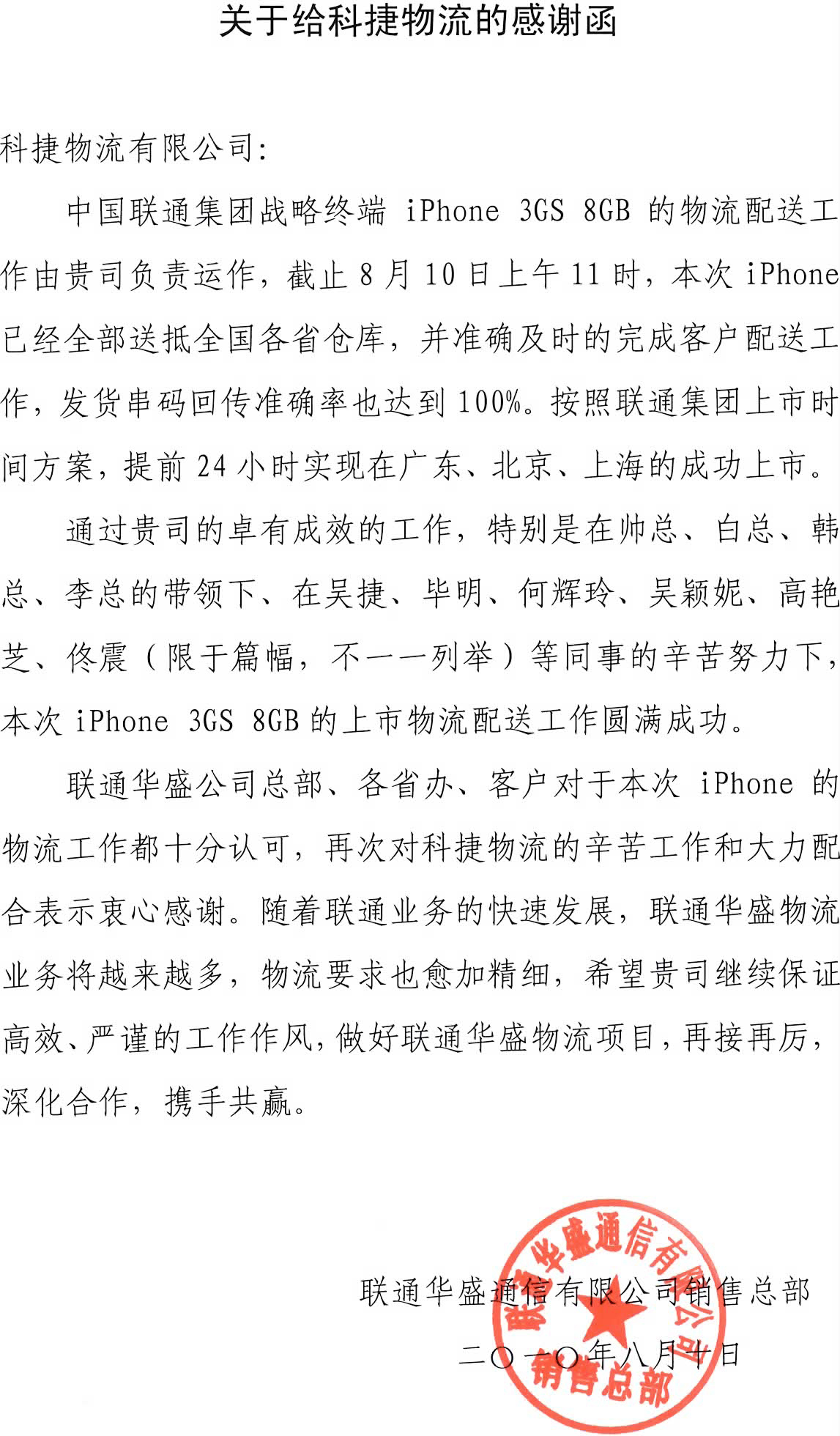 8月7日,我們迎來了聯(lián)通iPhone手機的首批到貨。經(jīng)過各位同事的努力,聯(lián)通iPhone項目第一批貨物全部到貨并已送抵全國各省倉庫。不僅如此,按照聯(lián)通集團上市時間方案,我們提前24小時實現(xiàn)在廣東、北京、上海的成功上市,第一階段的工作圓滿完成!科捷物流高效率、高質(zhì)量的運作,得到聯(lián)通方面高度認可,這與科捷相關(guān)同事為此項目所做的積極努力是分不開的。