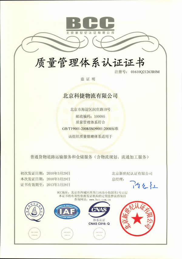 北京科捷物流有限公司于2010年3月29日取得了ISO9000證書,證書有效期三年。