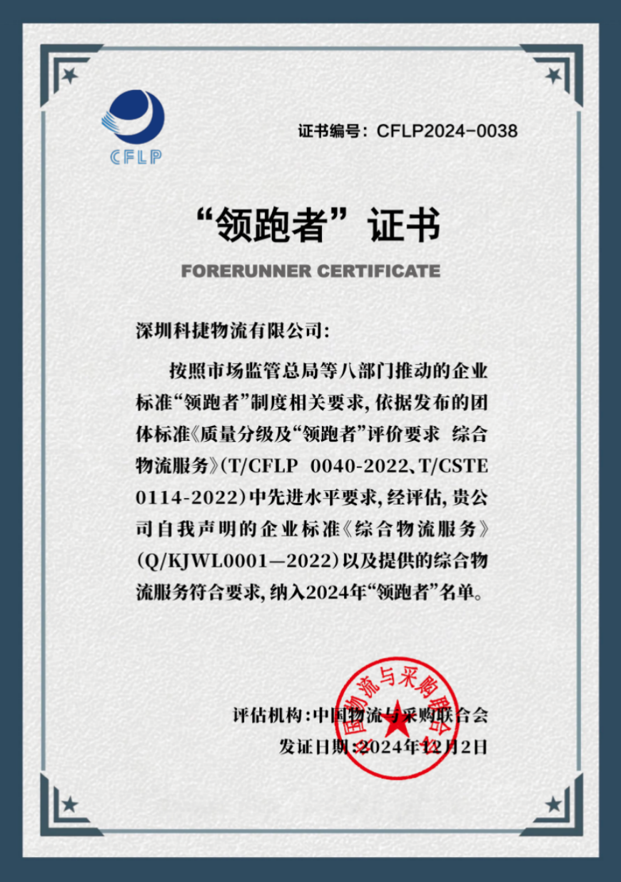 近日,經(jīng)中國物流與采購聯(lián)合會評估并公示,神州控股(00861.HK)旗下智慧供應(yīng)鏈品牌——科捷物流蟬聯(lián)國家級企業(yè)標(biāo)準(zhǔn)“領(lǐng)跑者”稱號。2022年12月,科捷獲評首批綜合物流領(lǐng)域企業(yè)標(biāo)準(zhǔn)“領(lǐng)跑者”企業(yè)。這是中物聯(lián)基于物流企業(yè)分級認(rèn)證后,對物流領(lǐng)域領(lǐng)先企業(yè)的更高標(biāo)準(zhǔn)評估認(rèn)定。