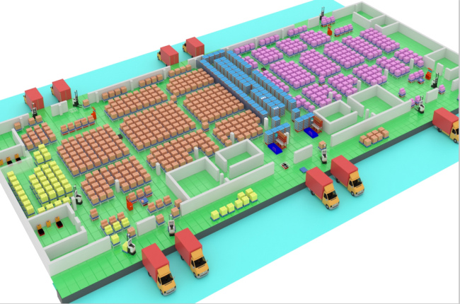 (圖注)整倉(cāng)實(shí)際上分了四塊業(yè)務(wù),左右黃色的區(qū)域是人工揀選區(qū),中間橙色部分是移動(dòng)終端的B2B業(yè)務(wù),藍(lán)色部分是手機(jī)的B2C業(yè)務(wù),紫色部分是神州數(shù)碼的業(yè)務(wù)。在這個(gè)全倉(cāng)的布局來(lái)看,整個(gè)規(guī)劃實(shí)際上是一個(gè)B2B和B2C業(yè)務(wù)的場(chǎng)景。