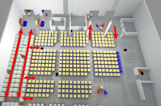 (圖注)是倉(cāng)內(nèi)的布局圖。其中里面紅色的箭頭是整個(gè)入庫(kù)和出庫(kù)的動(dòng)線,這個(gè)動(dòng)線代表了機(jī)器人的行走路線和兩個(gè)業(yè)務(wù)合并。也就是左側(cè)實(shí)際上是一個(gè)B2C的業(yè)務(wù),右側(cè)是一個(gè)B2B的業(yè)務(wù)。